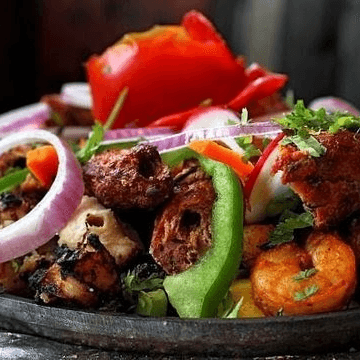 Combination Platter of tandoori-chicken tikka, chicken seekh kebab, lamb seekh kebab. Served with basmati rice
