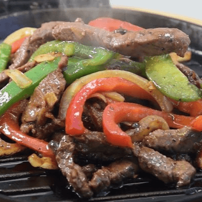 Stir-fried beef in a sizzling sauce, carrot, green pepper & amp; Served on hot steel pan